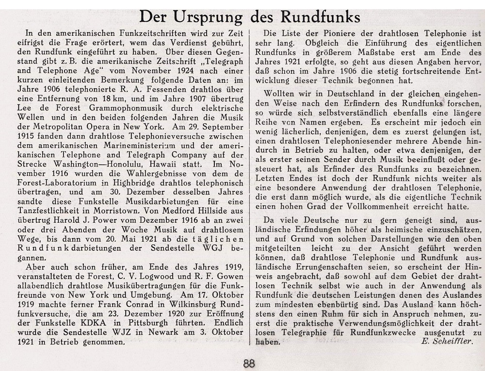 Einfacher wird es bei der Beurteilung des Rundfunks: Ab wann gab es Geräte zu kaufen ohne auf Bastelkram angewiesen zu sein, ab wann strahlten Rundfunksender mit nennenswerten Leistungen? Hier kann man ziemlich genau das Jahre 1921 benennen, z.B. in Frankreich oder in den USA. In Deutschland bekannterweise erst zwei Jahre später. Den technischen Vorsprung der Amerikaner kann man in der Telefunken Festschrift "25 Jahre AEG-Telefunken" an vielen Stellen herauslesen. Die Gründe liegen auf der Hand: Verlorener erster Weltkrieg, besetztes Rheinland, Hyperinflation usw.