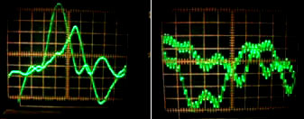 Die Ergebnisse bei ca. 65 MHz Abstimmfrequenz: HF Messender mit einigen 10 mVeff ergab sowohl in AM als auch in FM (Modulationsgrad 30 Prozent) ca. 100 mVss NF an 8 Ohm. Die Abstände der Flankenmaxima lagen bei 400 kHz (Die Oszillogramme zeigen den Übergang vom Flankenmaximum zum Resonanzmaximum, bei dem das minimale NF Signal auftritt). Das wirft die Frage auf: Wenn die nutzbare Flanke ohne Rückkopplung schon weniger als 200 kHz breit ist, dann könnte eine Rückkopplung für UKW FM schnell zu schmalbandig werden. Bei Flankendemodulation dürfte die Selektion schwächerer Sender zusätzliche Schwierigkeiten machen wegen Überlappung. Damals wurden abstimmbare Sperrkreise empfohlen.