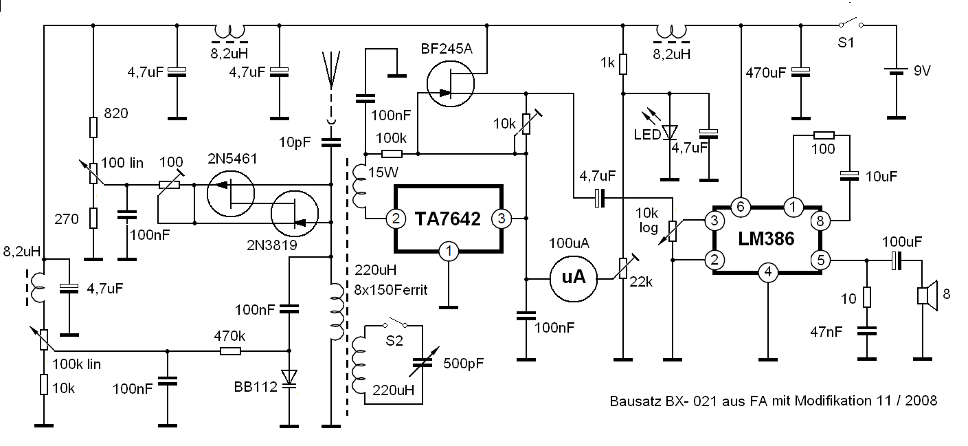 Durch einen Artikel im FA von 2008, stieß ich auf den Radiobausatz BX-021, der ab 2007 zum Kauf angeboten wurde. Leider ist dieser interessante Bausatz heute nicht mehr erhältlich. Um weitergehende Informationen zu erhalten, kontaktierte ich den Autor des Artikels DLX1R. Der freundliche Herr, der früher in der DDR, in der Fernsehentwicklung arbeitete, bot mir seinen letzten vorhandenen Bausatz an und so kam es, dass ich dieses wunderbare Radio mein Eigen nennen darf. Für starke Ortssender ist das Gerät noch weitergehend modifiziert.