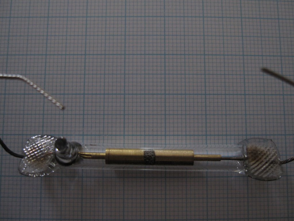 Mein Fritter ist aus einer alten 50mm 315mA Feinsicherung gebastelt. Die Kontakte müssen sehr stark mit dem Lötkolben erhitzt werden, dann löst sich der Kleber und die Sicherung kann ausgeräumt werden. Als Elektroden dienen Messingschrauben, deren Köpfe auf 6mm abgeschliffen wurden. Den Abstand der Elektroden wählte ich beim ersten Versuch auf 3mm. Es ergab sich aber keine hochohmige Strecke im Glaskolben, da meine eingefüllten Kupferspäne sehr grob sind.