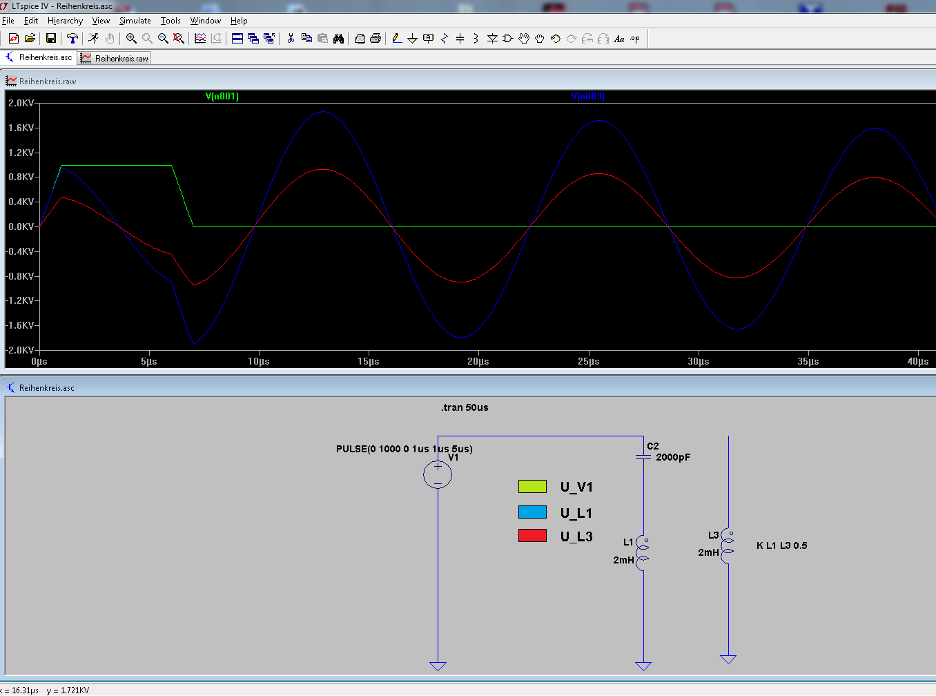 Für eine anständige Funkenstrecke will ich nun eine alte Zündspule vom Moped oder Auto besorgen. Hier zwei Bilder zur Erzeugung gedämpfter Wellen, um mal eine Vorstellung vom Aussehen des Funkensendersignals zu bekommen. (SpiceIV Simulation) Ein 1KV- Impuls simuliert hier den Überschlag der Funkenstrecke (V1). Auf dem zweiten Bild sieht man das Abklingen des Signals bedingt durch die Verluste im Schwingkreis.