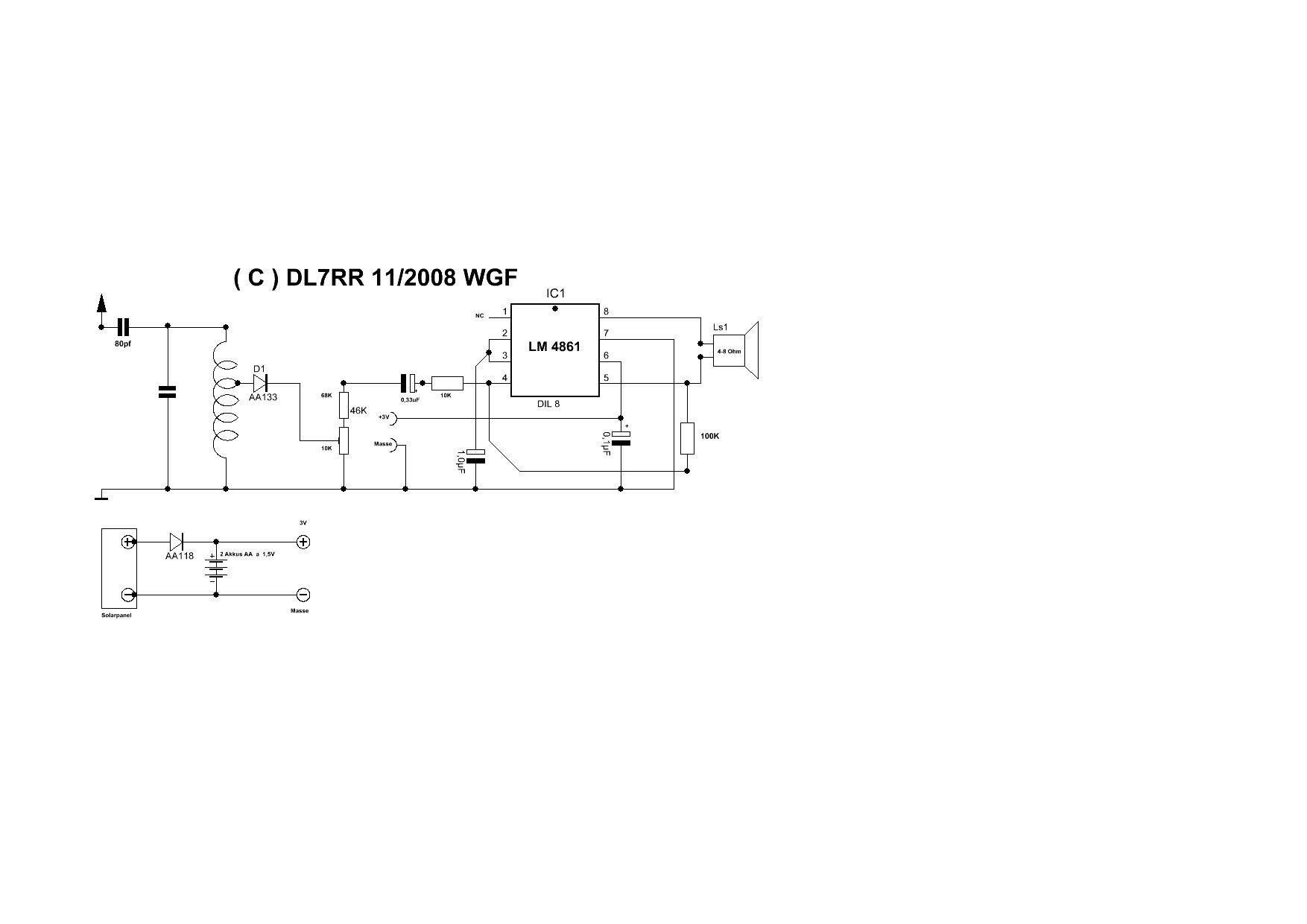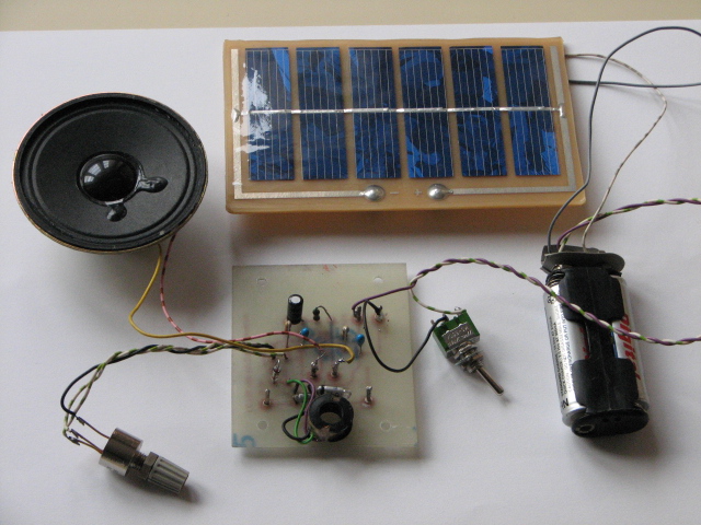 ich möchte Euch mein letztes Bauprojekt einen Solardetektor vorstellen. Monatelag lag in einem Wirrwar von Dräten,Spule und Drehko eine Detektorschaltung auf dem Tisch,hinderlich hierbei war daß nur mit Kopfhörern gehört werden konnte.Ich träumte von einem Detektor der am Fenster steht und mit einem Lautsprecher bei ausreichender Lautstärke spielt.Zur Verstärkung des gleichgerichteten Signal schied ein Transistorverstärker wegen des hohen Stromverbrauches und fehlendem Trafo aus,ebenso eine eisenlose Endstufe!