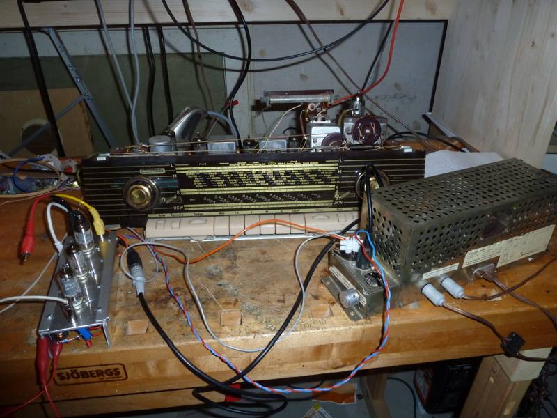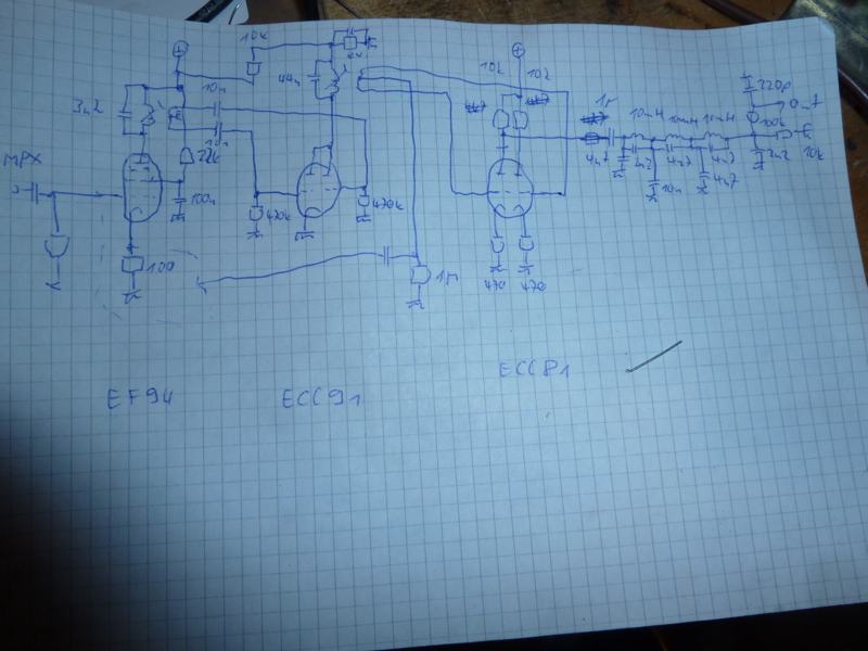 Die EF94 verstärkt das Multiplex-Signal und filtert mit dem Schwingkreis den 19kHz-Pilotton heraus. Hier steckt die grösste Herausforderung, denn der Pilotton hat nur etwa 10% der Signalamplitude, und Reste der Modulation auf dem ausgefilterten Pilotton stören die Dekodierung. Hier ist vermutlich noch ein zweites Filter am Eingang notwendig. Die ECC91 arbeitet als Frequenzverdoppler, um aus dem Pilotton wieder den 38kHz-Hilfsträger zur Demodulation des Differenzsignals zu erzeugen. Die Funktion ist im Prinzip eine Vollwellengleichrichtung mit Verstärkung, ähnlich wie beim Audion, aber doppelt. Die Steuerspannung ist so hoch, dass die Trioden während der negativen Halbwellen vollständig sperren. Somit leitet durch die gegenphasige Ansteuerung bei jeder Halbwelle des 19kHz-Signals eine der beiden Trioden, so dass der Anodenstrom eine Frequenz von 38kHz hat, welche durch den Schwingkreis ausgefiltert wird. Auf der Sekundärseite des Ausgangstrafos wird dem 38kHz-Träger das Multiplexsignal über die Mittelanzapfung hinzugefügt. Dadurch entsteht ein amplitudenmoduliertes Signal, bei dem die eine Hüllkurve dem linken und die andere dem rechten Audiosignal entspricht. Durch die symmetrische Sekundärwicklung hat man zwei gegenphasige Signale, so dass man für beide Audiokanäle die positive Hüllkurve demodulieren kann. Die Demodulation übernimmt die ECC81. Der Arbeitspunkt ist so gelegt, dass die Röhre ohne Ansteierung gesperrt ist. Die positiven Halbwellen steuern die Röhre auf und liefern so an der Anode das NF-Signal, während die negativen gesperrt bleiben. Am Ausgang folgt noch ein aufwendiges LC-Filter, das die Frequenzen über 20kHz (38kHz-Schaltfrequenz samt Seitenbänder) unterdrückt. Damit die Verzerrungen klein bleiben, müssen die Amplituden der Signale und der Arbeitspunkt passen, hier bin ich noch am Optimieren. Die negative Gitterspannung beziehe ich mittlerweile von den Gittern der ECC91. Diese Spannung ist nur bei einem Stereosignal vorhanden, so dass bei Mono-Empfang die ECC81 ohne negative Gitterspannung im normalen A-Betrieb das Eingangssignal verstärkt. Erste Messungen zeigten eine Kanaltrennung von 30..40dB und ein Klirrfaktor kleiner als 1%, was gar nicht so schlecht ist. Hier noch die Bilder des Aufbaus: