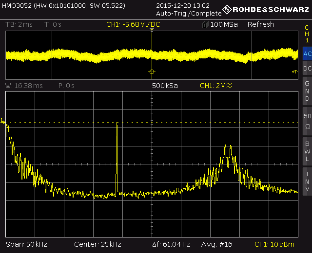 Zum Schluss noch das NF-Spektrum über eine Breite von 50kHz (5kHz/Div und 20dB/Div). Hier sieht man die Wirkung des Ausgangsfilters, das ab etwa 22kHz mit 40dB dämpft und so den systembedingt sehr starken 38kHz-Hilfsträger kräftig dämpft, so dass er etwa 40dB unter der NF-Amplitude ist und damit keine Probleme mehr bereiten sollte. Der 19kHz-Pilotton wird nicht weggefiltert, da sonst die Eckfrequenz tiefer sein müsste, was den NF-Frequenzgang stört. Da der Pilotton gemäss Norm nur 10% der maximalen NF-Amplitude hat (und damit nur 1% der Leistung), sollte damit jeder Hochtöner klarkommen, der bekommt so bei einer Spitzenleistung von 100W gerade mal 1W vorgesetzt. Die Welligkeit zwischen 15kHz und 20kHz kommt vom Filter, denn für diese Steilheit muss sowohl im Durchlassbereich als auch im Sperrbereich eine Welligkeit in Kauf genommen werden. Da das NF-Signal senderseitig bei 15kHz abgeschnitten wird, stört diese Welligkeit nicht gross, durch den leichten Anstieg gegen 15kHz wird der Ton etwas heller. Durch einen nachgeschalteten RC-Tiefpass kann das noch korrigiert werden.