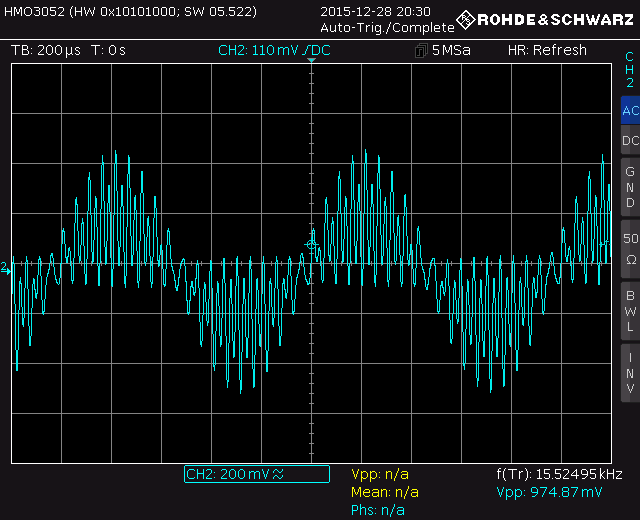Dasselbe Signal, so wie es aus dem Empfänger kommt: für eine Dekodierung absolut unbrauchbar, Kanaltrennung weniger als 6dB. Statt dem 38kHz-Signal mit den Sinus-Halbwellen als eine und der Geraden als andere Hüllkurve hat man das 1kHz-Summensignal mit überlagertem 19kHz-Pilotton, das 38kHz-Differenzsignal ist nur noch ansatzweise vorhanden. Durch einen sorgfältig dimensionierten und sauber abgeglichenen RC-Hochpass kann dieses Problem beseitigt werden, dieser ist bereits in der Schaltung vom Dekoder enthalten und muss an den Empfänger angepasst werden.