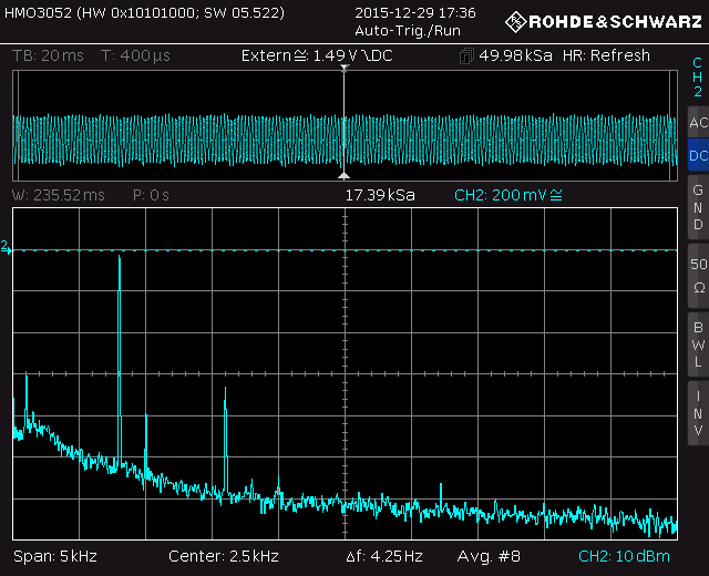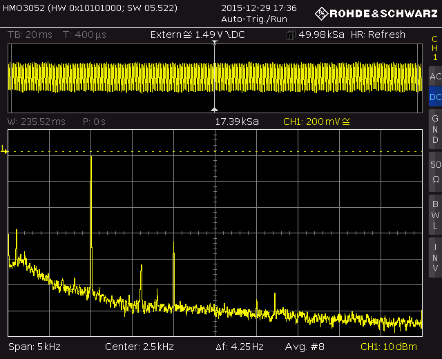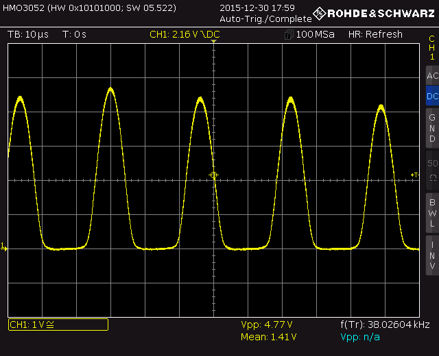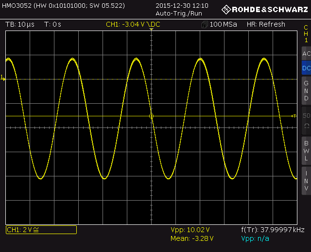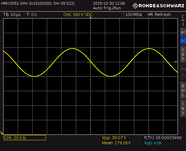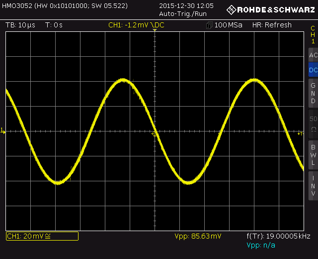 Zum Schluss noch ein paar Oszillogramme für den Fall der Fehlersuche. Das Eingangssignal ist dabei ein 19kHz-Sinus mit 150mV Amplitude.