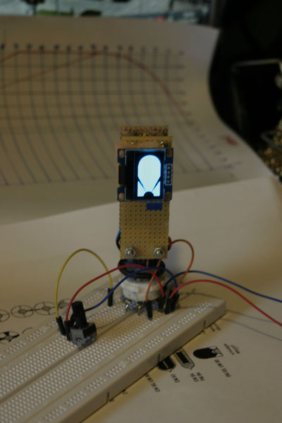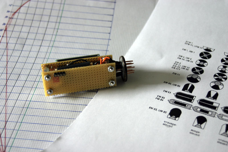 So mein Prototyp ist fertig. Er besteht aus einem Basismodul für mehrere LED-Bildschirme und zum Einstecken in eine Röhrenfassung. Die Betriebsspannunng für alle Komponenten (Prozessor, OLED, Operationsverstärker usw.) wird aus der AC-Wechselspannung für die Heizung gewonnen.