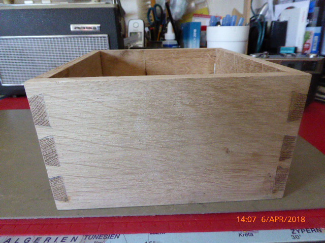 ja Zinken mit 10 mm starken Eiche Massivplatten, musst Du mal machen. Ich habe ja Schreiner gelernt. Eine Zinkenlehre hatte ich mir mal gebaut. Die gezeigten sind Exakt nach der Breite berechnet. Natürlich kann man auch Gerung-Verbindungen machen. Aber hier ist an das Handwerk eine klein Hommage gestellt. Es hatten ja auch viele kleine Holzwerkstätten Gehäuse für die Detektoren und andere "Kisten" gefertigt. Das Gehäude werde ich mit Schellack Pollitur behandeln. Audion mit Rückkopplung soll es werden. Röhre muss ich noch finden, muss ja zum Schaltpan passen.