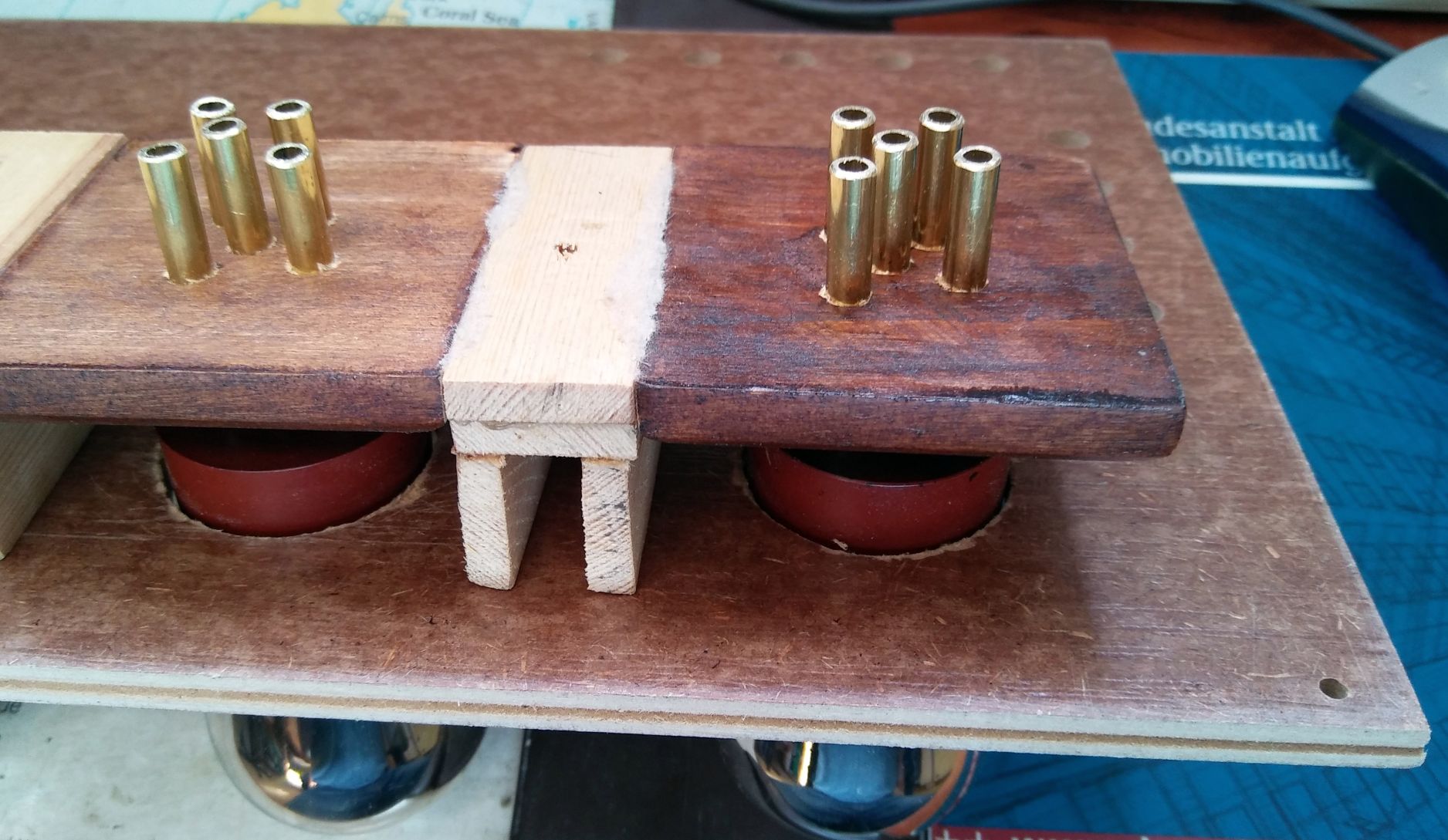 Ein wesentlicher Beweggrund ist das Austesten der einen oder anderen Reflexschaltung. Diese "ruhig" zu bekommen, ist nichts für Anfänger. Vorher müssen aber konstruktive Dinge geklärt werden, immer nach dem Motto: sollte nichts kosten. Bei den Fassungen ist mir das bereits gelungen, wie die Bilder zeigen. Es wurden Messingröhrchen (innen 3 aussen 5 mm) ohne nötige Klebung ins Holz getrieben. Das funktioniert aber nur bei präzisem Arbeiten.