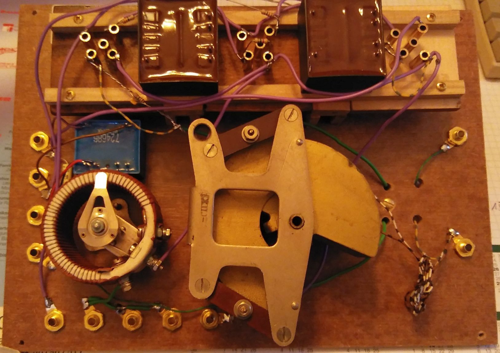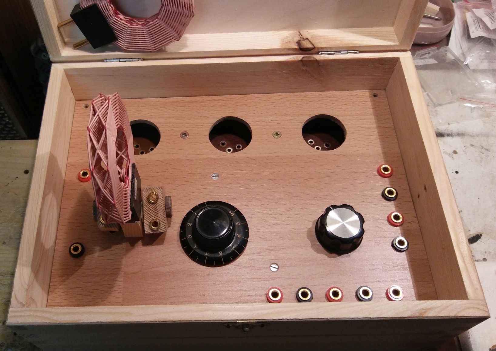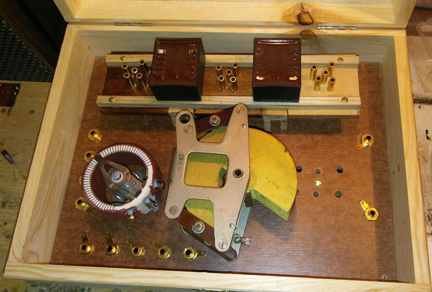 kleiner Zwischenstand: die erforderlichen Hauptkomponenten konnte ich gut im Gehäuse unterbringen. Das überdimensionierte Poti hat 10 Ohm, der Drehko einen ungewöhnlich hohen Abstimmbereich zwischen 25 und 900 pF. Den gleichen Typ habe ich im OE333-Nachbau verwendet.