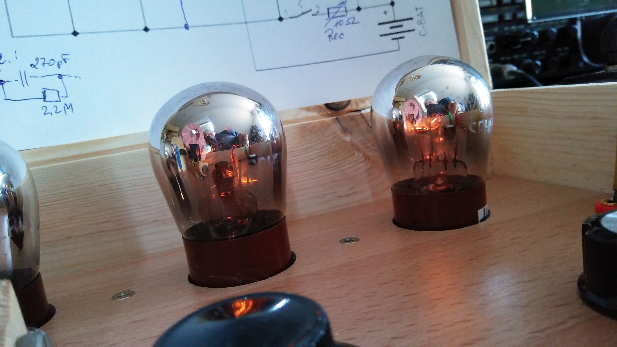 noch was zur Demodulation: Ich vermute, dass bei schwachen Signalen die erste Triode als HF-Verstärker arbeitet und die zweite Triode als Audion, während bei stärkeren Signalen bereits die erste Triode übersteuert wird und so als Demodulator arbeitet, indem die Spitzen der einen Halbwelle 'geköpft' werden. Das würde auch gut die verschlechterten Empfangseigenschaften bei höheren Frequenzen erklären.