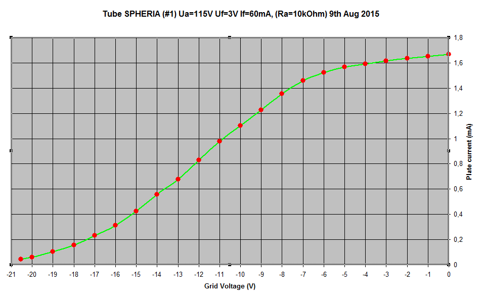 Meine drei Exemplare zeigen ein ähnliches Verhalten: Bei einer Heizspannung von 3 Volt geht der Anodenstrom schon bei 1,7 mA in die Sättigung. Der Nennstrom soll bei 2 mA liegen, die aber nur in der Audioendstufe ausgeschöpft werden müssen. Bei meinen Röhren beträgt der Heizstrom schon bei diesen 3 Volt 60 mA - eine Heizspannung von 4 Volt halte ich für zu hoch. Die Röhre soll mit Sicherheit zwischen 3,3 und 3,6 Volt über einen damals üblichen regelbaren Vorwiderstand (Rheostat) betrieben werden, ähnlich wie das auch für die Radio Micro von Radiotechnique gilt. Bei Emissions- prüfungen im Funke W19 und Verwendung der Karte 9 ergaben sich bei einer Heizspannung von 3,3 Volt 4 mA und bei 4 Volt 6 mA Anodenstrom.