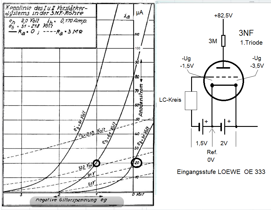 Was die Frage nach dem Demodulationsverfahren in der 1. Triode beim OE333 betrifft, so meine ich, haben wir es mit einer Anodengleichrichtung (Richtverstärker) zu tun. Erläuterung: Durch den hohen Ra ist die 1.Triode schnell gesperrt. D.h. schon eine kleine neg. Ug verlagert den Arbeitspunkt in den unteren Knick der Kennlinie.