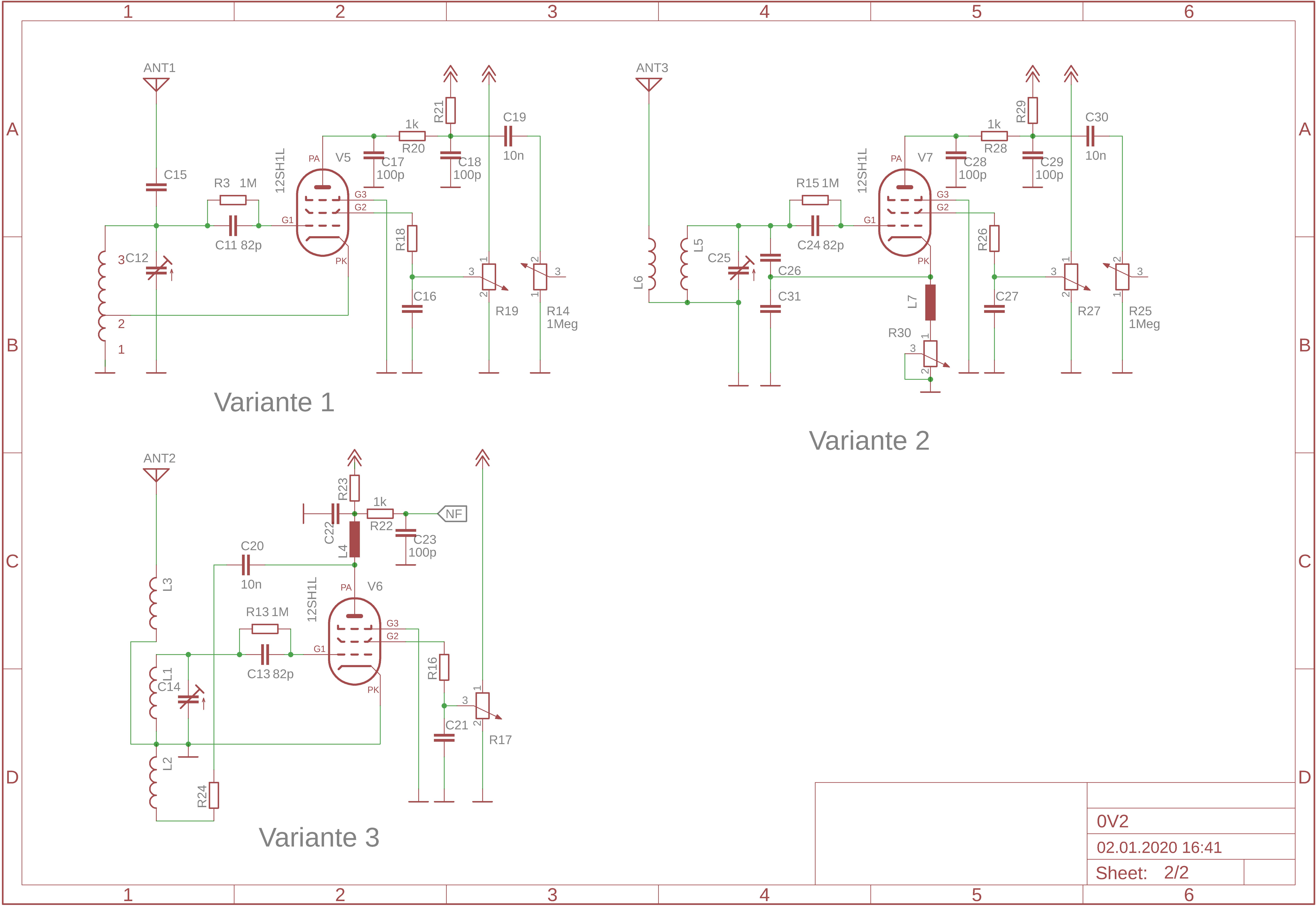 Wie ich die Schaltungen bisher verstanden habe arbeiten die Varianten auf unterschiedlichen Arbeitspunkten. Während bei Variante 1 und 3 die Kathode gleichstrommäßig auf Masse liegt, kann in der Variante 2 der Gleichstromarbeitspunkt verschoben werden, ohne dass sie die Kopplung ändert. Ich teste mal die Varianten 1 und 2 im MW Rundfunkband.