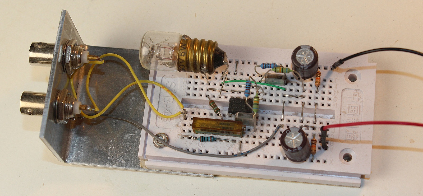 Anbei ein Foto von einem Versuchsaufbau mit dieser Lampe. Verstärkerelement ist in diesem Fall ein OpAmp 5534. Klirrfaktor liegt im vorliegenden Beispiel bei 1kHz Festfrequenz nahe meiner Nachweisgrenze von 0.001%. Bei niedrigen Frequenzen haben Glühfäden trägheitsbedingt einen höheren Klirfaktor.