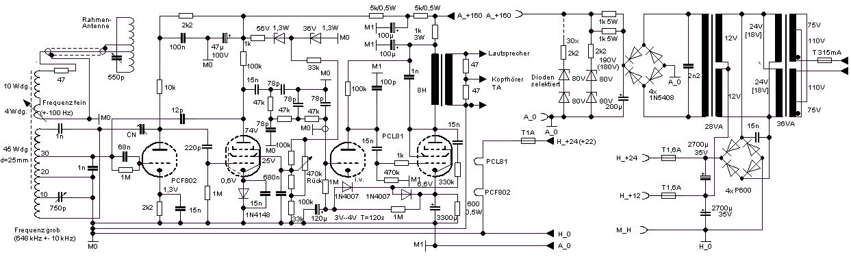 Bezeichnungsschema: man hat das ja nach der Verwendung der Röhren festgelegt, um grob die Leistungsfähigkeit des Empfängers angeben zu können, ebenso unterschied man ja "Einkreiser" und "Zweikreiser" Hier kann man stur darnach gehen: Die Triode wird zur HF-Verstärkung benutzt, es ist die einzige Stufe vor dem Gittergleichrichter, dem Pentodenteil der PCF802. Dann folgen noch zwei weitere Röhren für die NF, die Anzahl der Verstärkerstufen bestimmt die Zahl nach dem "v"