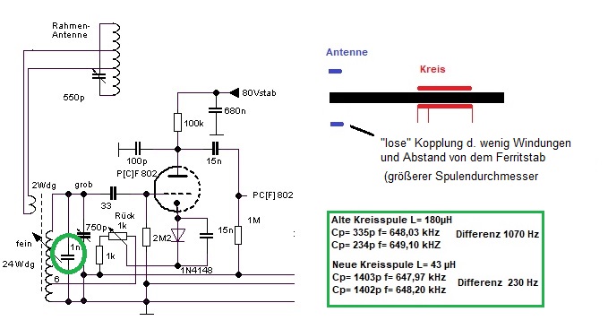 Frequenz-Feineinstellung Daher Frequenz-Feineinstellung, die als Permeabilitätsabstimmung mit 6mm-Messing-Röhrchen gemacht wurde: Durch die Anordnung der einzelnen Stäbe ist eine recht lineare Einstellung erzeugt, die Frquenz steigt, wenn die Stäbe der Ferritstabspule angenähert werden. Maßnahmen Frequenzstabilität Hohe Frequenz-Konstanz erhält man bei sehr schwacher Ankopplung des Audion-Kreises und Anwendung einer 2-Röhren-Schaltung, die erste Röhre kann neutralisiert werden (veränderliche Gitter-Anodenkapazität, "Miller-Effekt"): Die KW-Spule rechts (um 1960) soll einen weiteren Punkt zeigen: Die Temperaturabhängigkeit der Kreisspule. Die gezeigte Spule wurde seinerzeit fest auf Keramik gewickelt. Schaltung des letzten Versuchaufbaus: Erwärmung Netztrafo Verursacht über längere Zeit Heizspannung-Verringerung. Eine einfache Stabilisierung der Heizspannung brachte hier deutliche Verbesserung. Die Audionröhre sollte deshalb auch nicht unterheizt werden.