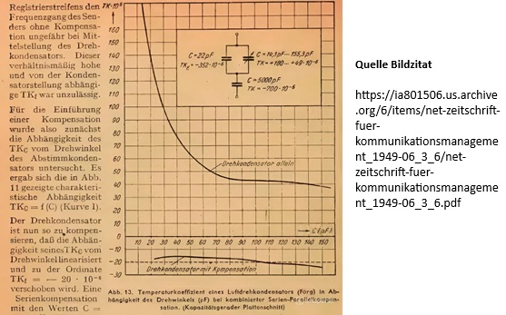 - Es lässt sich die Kompensation dadurch leicht bewerkstelligen, dass der Serienkondensator in passender Weise aus Kondensatoren mit positivem oder negativem Temperatur-Koeffizienten zusammengesetzt wird. - Der Abstimmbereich erweitert sich nach unten hin von 510 kHz nach 430 kHz.
