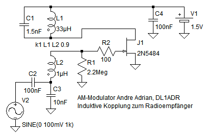 Zweiter Nachtrag: Dies ist Version 3 der Schaltung. Durch die kleine Speisspannung von 1.5V wird der maximale Modulationsgrad besser. Die Schaltung R1, C2, L2 wirkt für den Mischer D1 als Addition von NF und HF Spannungen. Die Schaltung D1, L2, C2 wirkt für J1 wie eine Gitterkombination und sorgt für einen guten Arbeitspunkt und damit für gute Klangqualität.