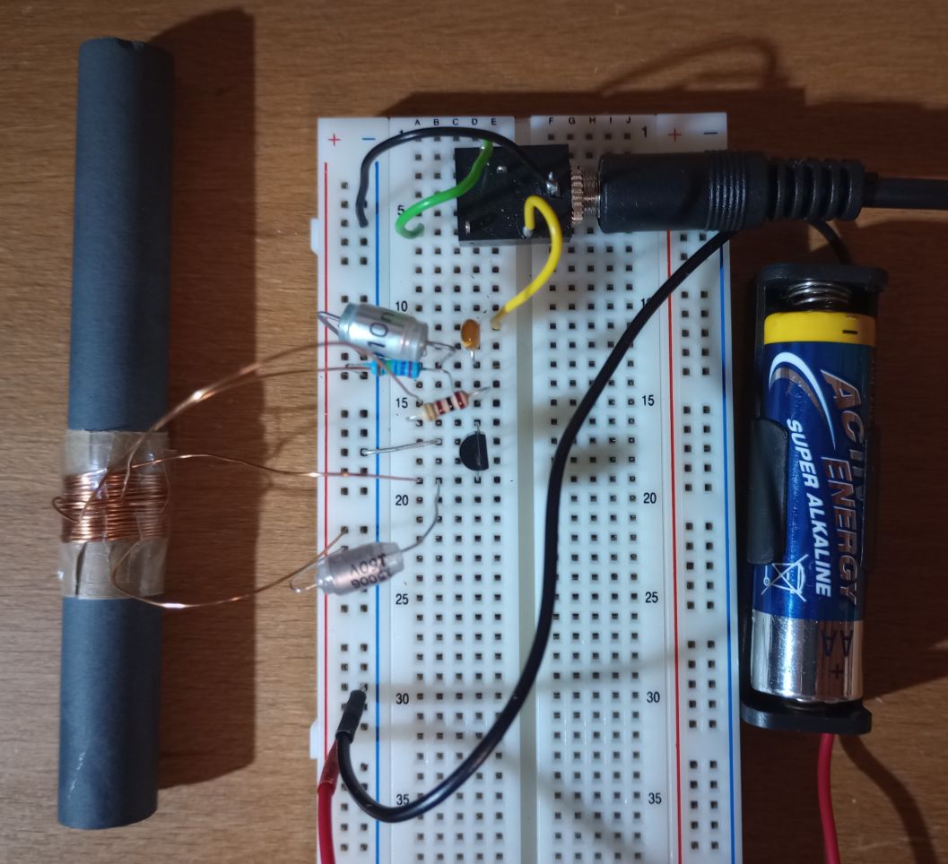 Die Schaltung ist ein Meissner Oszillator mit Schwingkreis am Verstärker Ausgang. Die NF kommt z.B. vom Line-Ausgang des Computer und lädt/entlädt C3 über C2. Die HF wird über L2 zugeführt. Die interne JFET Diode zwischen Gate und Source ist der Mischer, d.h. es ist ein "square law" Modulator. Die Gitterkombination besteht aus C3 und R1. L1 und L2 sind zwei Wicklungen auf dem Ferritstab Länge 10cm, Durchmesser 12mm, Ferritmaterial 61. Für L1 sind 17 Windungen nötig, für L2 3 Windungen. Für enge Kopplung ist L2 auf L1 gewickelt. Der LC-Schwingkreis hat große Kapazität und kleine Induktivität. Wes Hayward empfiehlt dies in seinem Buch "Introduction to Radio Frequency Design". R2 verhindert Oszillation auf Frequenzen von über 10MHz. Die Übertragung zum Radioempfänger erfolgt induktiv. Die Reichweite ist einige zehn Zentimeter. Speisespannung ist 1.5V.