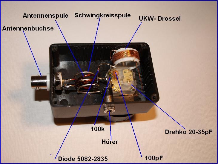 Nun musste ich feststellen, dass ich wohl ein Opfer von durchschlagenden KW- Stationen oder Ortssendern gewesen bin. Im nachhinein erscheint mir das auch logisch, denn bei einer Entfernung von 15km zur nächsten Station, ist Empfang auf UKW im Stadtgebiet, mit solch einem Gerät eigentlich nicht möglich. Bei meinem jetzigen Versuch baute ich die Schaltung gleich fest in ein Gehäuse ein und probierte verschiedene Spulenanordnungen und Kapazitäten ohne Erfolg aus. Da ich bezüglich der Entfernung zu zweifeln begann, begab ich mich auf eine Anhöhe im Berliner Stadtgebiet, nur 4km vom Alexanderplatz entfernt,.... dem Humboldthain einen ehem. Flackbunker aus dem 2. Weltkrieg. Der Fernsehturm am Alexanderplatz beherbergt gleich mehrere UKW- Stationen und ich konnte mir sicher sein, dass der gewählte Standort geeignet ist. In luftiger Höhe baute ich mein Gerät auf und musste unter den misstrauischen Blicken der Spaziergänger feststellen, dass nichts, auch kein typisches Rauschen des Flankendetektors, zu hören war. Ich war der festen Meinung, dass ich einfach mit meinen Schwingkreisparametern nicht die richtige Frequenz traf und somit auch nichts empfangen konnte. Auf dem Heimweg kam mir dann die zündende Idee wie ich den Frequenzgang überprüfen könnte. Ich stellte einen kl. NF modulierten UKW- Oszillator auf 95Mhz ein und verband ihn mit dem Antenneneingang des Detektors. Es war wieder nichts zu hören. Da ich gern Schottkydioden für Detektorgeräte verwende, habe ich mich beim Flankendetektor für den Einbau einer BAT46 entschieden. Die BAT46 hat sehr gute Eigenschaften bei MW und KW, war aber für den UKW- Bereich völlig ungeeignet. Im Datenblatt fand ich dann auch die verantwortlichen 10pF Eigenkapazität, die aus meiner Sicht das Problem verursachten. Eine Diode 5082-2835 (nur1pF) brachte dann den Erfolg und ich konnte das eingespeiste Oszillatorsignal auf Anhieb selektieren. Eine erneute Wanderung auf die Anhöhe war dann auch endlich erfolgreich und verschiedene Stationen, die vom Fernsehturm abgestrahlt werden, waren sofort zu hören. Ein lautstarkes Rauschen, welches auch vom Pendelempfänger bekannt ist, zieht sich über den gesamten UKW- Frequenzbereich. (ca. 60 Grad des Drehkos) Beim Abstimmen ist es sehr wichtig die Antenne in ihrer Länge und Ausrichtung an jede Frequenz anzupassen und dabei den Schwingkreis nachzustellen. Die Bandbreite ist recht erstaunlich und hätte ich so nicht erwartet. Eine leichte Verzerrung ist wohl normal und lässt sich nicht wirklich beseitigen. Dies kann den Detektorfreund aber nicht abschrecken, da es ja hierbei nicht um highend - Kulturgenuss, sondern um Radiobastelsport geht. Die doppelte Teleskopantenne war die richtige Entscheidung, da hiermit sehr flexibel agiert werden kann. Je 30 - 50 cm Auszug in horizontaler Ausrichtung brachten die besten Ergebnisse und bei vollausgezogener Antenne das meiste Rauschen. Eine knifflige Angelegenheit hier die optimale Einstellung zu finden. Ich wollte das Flachbandkabel der Antennenzuleitung nicht unnötig kürzen, da ich diese Antenne auch für andere Projekte benutze. Ob hier noch Verbesserungen in der Anpassung möglich sind, bleibt erst mal außen vor. Die Drossel stellte für mich generell ein Problem dar. Bei meinen Recherchen konnte ich keine konkreten Angaben finden. (uH). In einem älteren Artikel fand ich schließlich eine Angabe die ich auch für meinen UKW Pendelempfänger benutze. Die Luftdrossel soll nach einer Faustregel eine Drahtlänge von ca. ¼ Lambda haben. Das bedeutet bei ca. 3m Wellenlänge (88-100Mhz) ca. 0,75m Drahtlänge für eine Luftspule. Auf einem 20mm Wickelkörper ergibt das für 11-12 Windungen eine Induktivität von ca. 4uH . Wer sich für UKW- Empfang mit dem Flankendetektor interessiert sollte unbedingt Rainers Tipps auf http://www.oldradioworld.de/gollum/sloped.htm beachten und vorher checken, dass er im Umkreis von max.5Km eine FM- Station hat und die verwendeten Dioden nur eine niedrige Eigenkapazität aufweisen. Ansonsten.......nur Trauer.