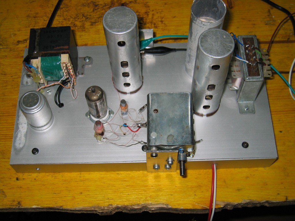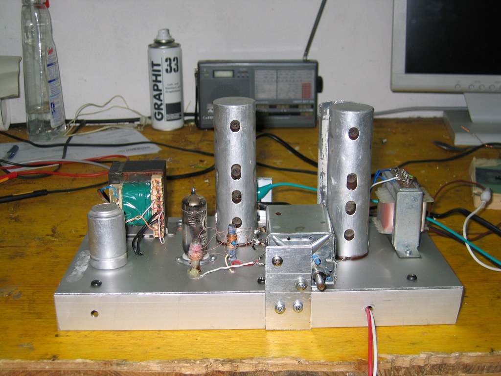 Hallo Miteinander Inzwischen macht meine EFL200 auch Krach.Das Netzteil besteht aus einen Trafo der anscheinend für einen Videorekorder bestimmt war. Er hat Fünf Sekundär Wicklungen: 2x8V, 1x34V, 1x20v und einmal 6V. Die ersten Drei Wicklungen habe ich in Reihe geschaltet.Sie ergeben nach den Brückengleichrichter und siebung mit einen 47uF Elko etwa 95V.Danach kommt ein Sieb Widerstand von 68 Ohm und ein Kondensator von nochmals 47uF.Die Parallelheizung erfolgt über eine 8V Wicklung und Zwei parallel geschaltete 2,7 Ohm Widerstände. Die Heizspannung an den Röhren beträgt 6,4 V. Der Ausgangstransformator ist ein ELA Trafo mit 3,2 KOhm.Macht ordentlich Lautstärke. Nächste Woche geht es an den ZF Verstärker.Ich hoffe, das ich dort ein wenig mehr Glück habe als Jürgen.Glauben tu ich es aber nicht so Recht... LG Norbert Wenn ein FS mit 15 Röhren läuft, ist der Anblick durch die Rückwand auf jeden Fall schöner und interessanter wie das Programm auf der Mattscheibe.