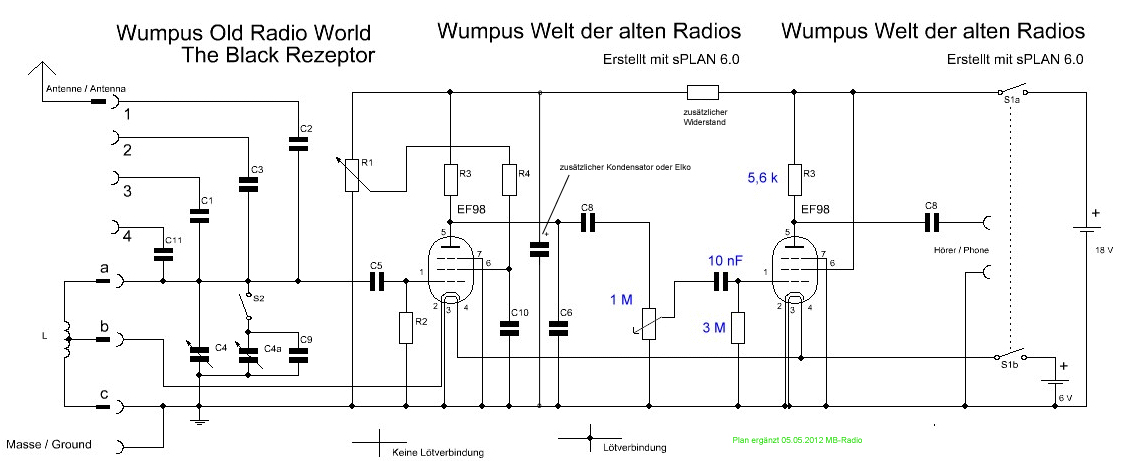 Ich habe zunächst den original Plan (der mit den zwei Stück EF98) aufgebaut und zwar ganz genau so. Gut so Dann habe ich um die dritte Röhre erweitert. Hier habe ich bei den Werten zwei Abweichungen: