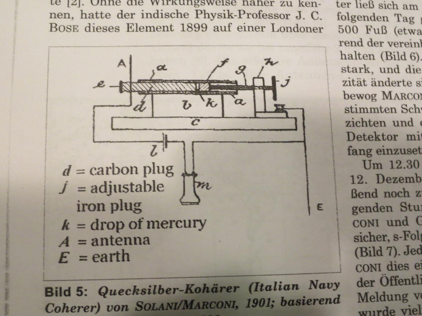 Ich habe doch tatsächlich in meinem Fundus einen alten Treppenhausschalter mit Quecksilberkontakt gefunden. Du kannst Dir bestimmt vorstellen...was ich damit für einen Blödsinn veranstalten will. Hier das urheberechtsfreie Bildchen des von Marconi im Transatlantikversuch benutzten Quecksilberkohärers. (Boseelement) Statt des Ölfilms wird wohl die fettige Kohle genommen. Ich vermute es....da von einem Ölfilm im Schema nicht die Rede ist. Die Empfindlichkeit 10x höher. Ein Klopfer wird nicht benötigt. Selbstlöschend.