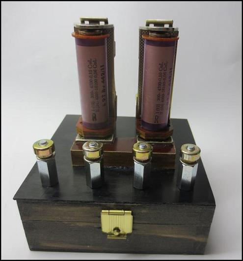 Das Gehäuse ist aus einer alten 10x10cm hölzernen Süßigkeitenbox, die ich eingefärbt habe. Der labbrige Sperrholzdeckel ist mit dem Rest einer schwarzen Isolierplatte beklebt und erreicht somit die nötige Festigkeit und auch ein ansehnliches Design. Die einzelnen Module, die jetzt nach und nach entstehen, werden dann später im finalen Aufbau auf eine Grundplatte geschraubt und miteinander verbunden.