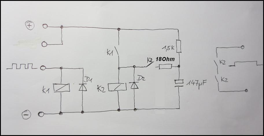 Ich brauche nun ein Relais, das während der Totzeit des Klopfers nicht abfällt. ca.150ms sind notwendig. Dann kann ich über die schon gezeigte Morsetaste und einer Lampe, Kurz / Lang übertragen. Der historische Morseschreiber muss noch abgeholt und überarbeitet werden. Das dauert noch etwas. Wie kann ich die Hysterese eines Relais vergrößern? Mit Kapazitäten zur Pufferung wollte ich hier eigentlich nicht arbeiten.