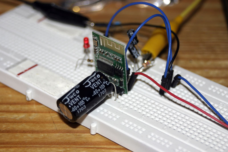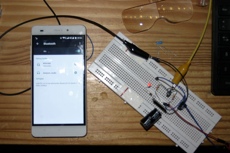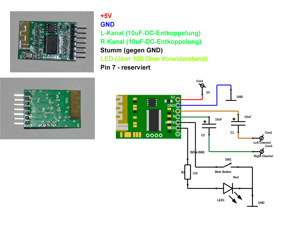 Wichtig sind die beiden 10uF Kondensatoren zur Entfernung des Gleichstromanteils von ca. 1.3 V auf beiden Kanälen. Die Betriebsspannung von 5V muss gut gefiltert und am besten mit 470uF nahe des Einspeisepunkts abgepuffert sein. Damit vermeidet man Resets des Chips oder Störungen auf dem Audiosignal. Nachdem der "C7" seine Betriebsspannung bekommen hat, wird über eine synthetische Sprachausgabe mitgeteilt "Bluetooth modus aktiv" das der Chip für das Pairing mit der Signalquelle bereit steht. In der Audioquelle (hier ein Smartphone) erscheint der Chip mit der Kennung "Win-668". Ein Passwort wird nicht benötigt, die Signalreichweite beträgt für eine stabile Übertragung ungefähr 10m unter Sichtbedingung, ein Passwortschutz ist also nicht unbedingt nötig. Die Stromaufnahme beträgt im Streaming durchschnittlich 40-45 mA.