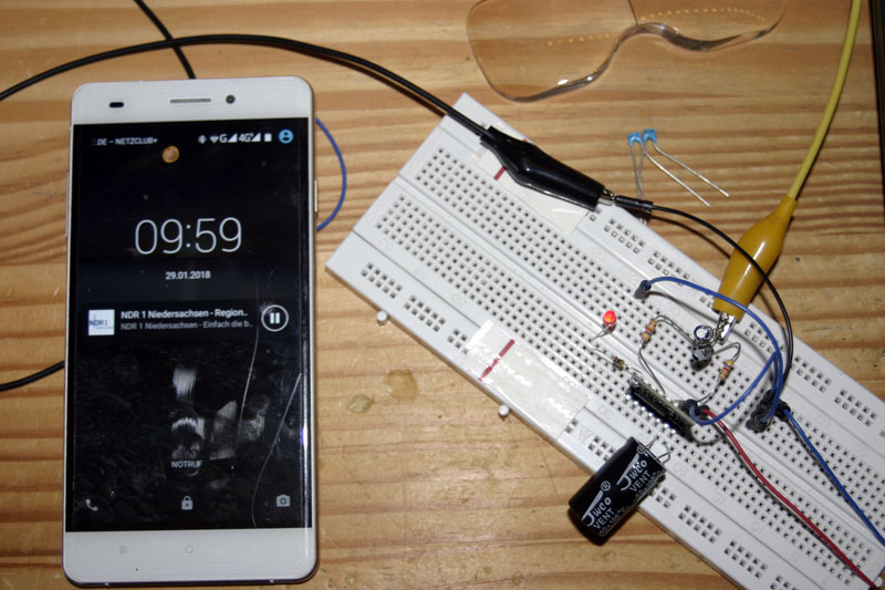 Einmal eingebunden verhält sich der Chip wie ein normaler Funklautsprecher und alle Systemtöne der Quelle werden auf ihn rübergefunkt (neudeutsch: gestreamt). Hier also das Radioprogramm von NDR 1 Niedersachsen aus einer Internetradioapp. Links daneben der Versuchsaufbau mit dem Modul.