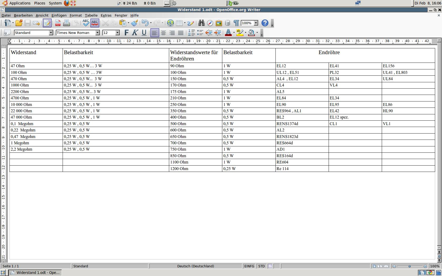 Habe wegen der positiven Resonanz aus der gleichen Quelle eine Widerstandstabelle erstellt . Die Katodenwiderstände der Endröhren habe ich nicht auf E12 umgestellt , es sind die alten Werte . Ich hoffe der eine oder andere kann damit was anfangen .