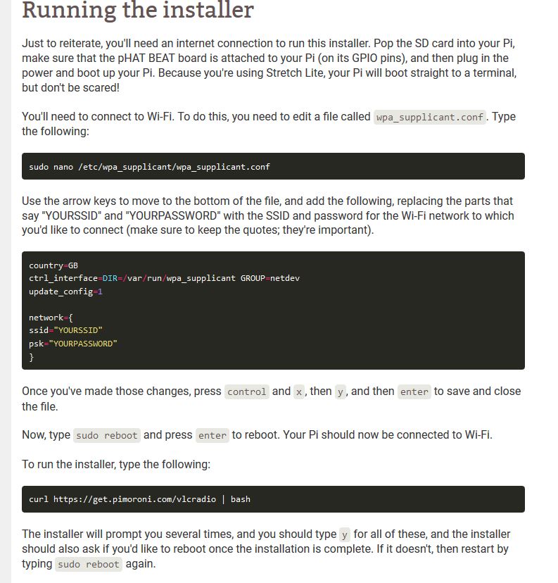Da im Auslieferungszustand des Betriebssystems kein Remote-Zugang installiert ist, bleibt für Windows-Nutzer die keinen Linuxrechner rumstehen haben, nur die Möglichkeit einen Monitor per HDMI und eine USB-Tastatur an das Radio anzuschließen und nach obiger Anleitung vorzugehen. Nachdem man sich mit dem Zugang (Standardnutzer: pi /Passwort: raspberry) eingeloggt hat (ACHTUNG: falls der Pi Zero mit englischem Tastaturlayout bootet: y und z sind vertauscht), muss man mit einem Editor (hier "nano") die Datei wpa_supplicant.conf mit den Zugangsdaten anlegen (siehe Herstelleranleitung).
