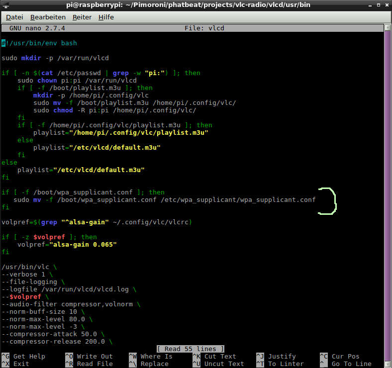 Das zu verändernde Script "vlcd" liegt in ~/Pimoroni/phatbeat/projects/vlc-radio/vlcd/usr/bin Nach der Änderung muss noch das Shellscript setup.sh aus dem Verzeichnis ~/Pimoroni/phatbeat/projects/vlc-radio einmalig aufgerufen werden.