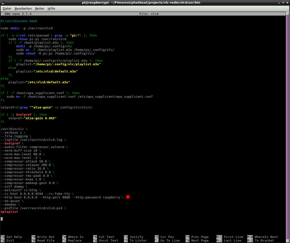 Es reicht nicht aus dem Standardbenutzer (pi/raspberry) einfach ein neues Passwort zu geben. Das Passwort für den Webzugang wird ganz wo anderst geregelt, nämlich in der Datei ~/Pimoroni/phatbeat/projects/vlc-radio/vlcd/usr/bin/vlcd Man öffnet die Datei zum Beispiel über einen Remotezugang und dem Editor "nano". Fast ganz unten (siehe Markierung im Bild) sieht man die Option --http-password raspberry