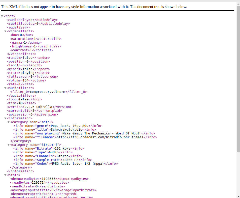 Nun wäre aber vielleicht noch die Frage was man auf dem LCD-Display anzeigen will zu klären. Eine Programmnummer gibt es nicht, die Streamadresse aus der Playlist ist doch eher kryptisch, .... Gibt es da eine Lösung? Die Antwort: Ja! Die Playersoftware vlc zeigt, wie im RBF schon erwähnt, in seinem Webinterface verschiedene Daten zum Stream an, die sie sich selbst aus den Streamdaten zieht und die geeignet sind auch auf einem Display zu erscheinen. Aber wie kommt man an diese Daten vom vlc-Prozess? Nun es gibt einige Media-APIs zu VLC in allen nur erdenlichen Programmiersprachen. Diese APIs sind sehr umfangreich und setzen meist voraus das man von einen eigenem Prozess aus die Player startet. Viele Umbauarbeiten in der Software wäre das Resultat. Vielleicht ein Plugin für den Player schreiben? Geht es noch einfacher? Ja und zwar über das bereits beschriebene Webinterface. Gibt man in einem Webbrowser folgende Adresse ein: http://IP_DES_RADIOS:8080/requests/status.xml erhält man eine Seite die so aussehen könnte:
