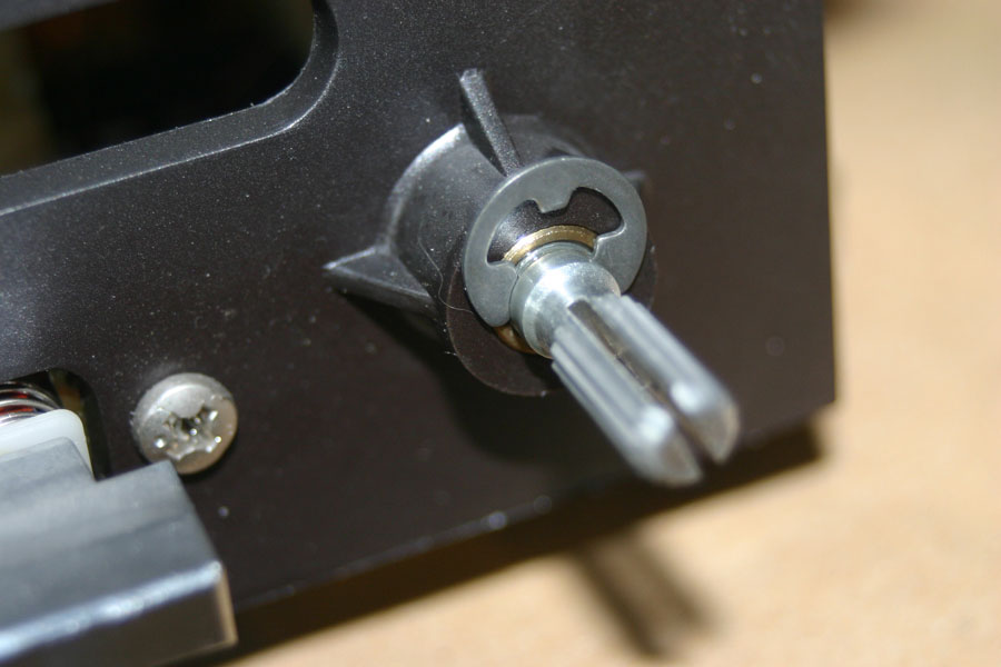 Entfernt man nun diese Sperre, dann lässt sich die Antriebsachse leicht nach hinten drücken. Könnte man damit nicht sogar den Taster eines Drehencoders bedienen? Ich denke schon.