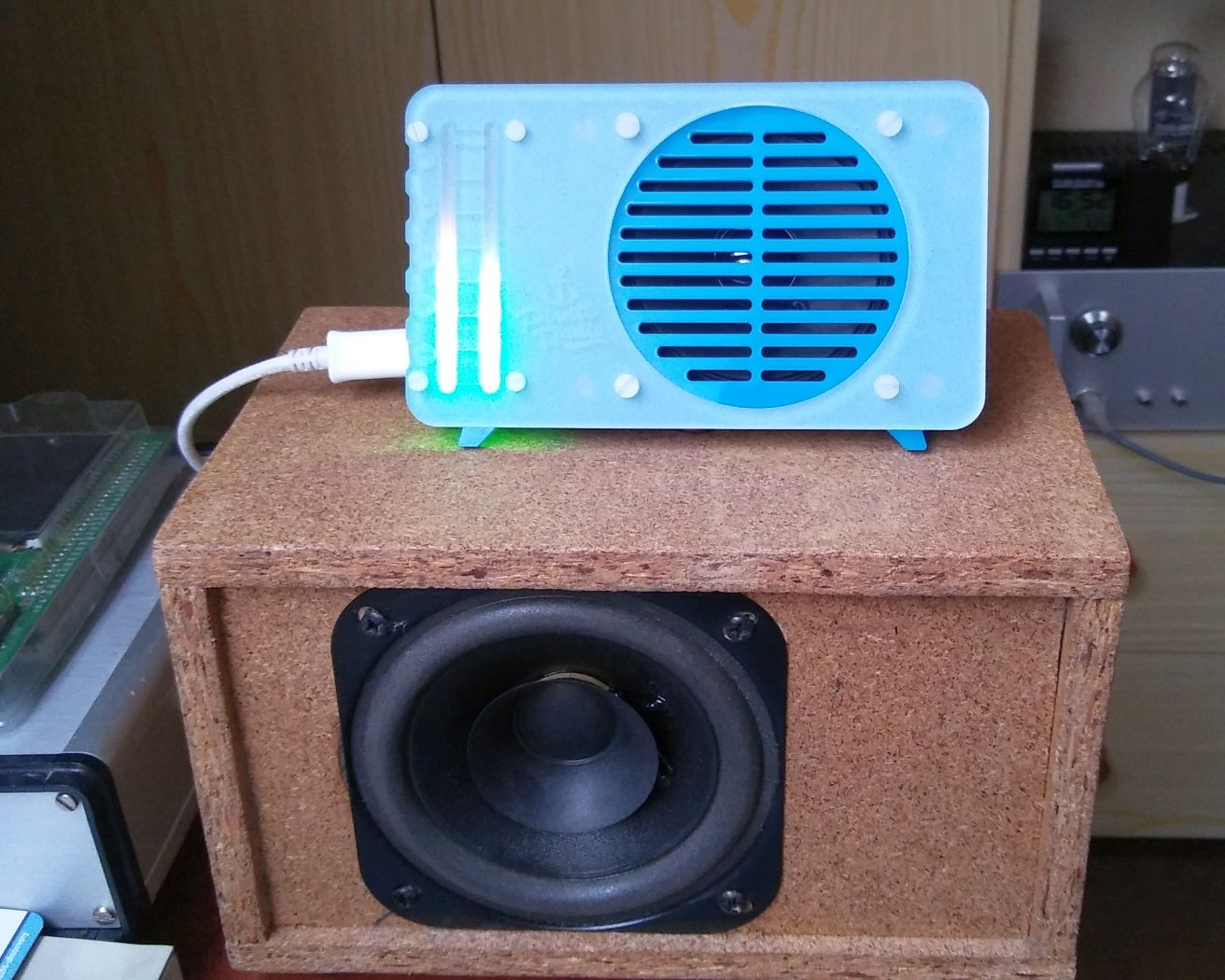 nach tagelangem Abmühen mit Linux hat mir Bernhard das geänderte Image für den Pimoroni zugeschickt. Damit war die Einrichtung bzw. Konfiguration eine Kleinigkeit. Ansonsten kann ich jedem ohne gute Linux-Kenntnisse von dem "Projekt" nur abraten. Das Internet Radio spielt gut, der akustische Kurzschluss quälte allerdings meine Ohren. Zuerst habe ich mit dem Gedanken gespielt, ein Gehäuse aus Laminatresten um den Pimoroni zu bauen. Da ich den Batteriebetrieb aber schnell verworfen musste (die Platinen werden warm), habe ich mit meinen akustischen Programmen ein wenig gespielt und konnte ein Lautsprechergehäuse mit Innenabmessungen 13,5 x 8 x 5,5 cm ebenfalls verwerfen. Mit einem Rauminhalt von 0,5 Liter ist kein vernünftiger Klang zu erzielen, selbst das "Franzis-Retro-Radio" bringt es auf 0,8 Liter. Ich habe daher eine Regalbox in den Abmessungen des "Tivoli Audio One" (Rauminhalt 2 Liter mit dem Bassreflexrohr an gleicher Stelle) angeschlossen und bin nun zufrieden. Die Leistung reicht für eine gute Lautstärke aus. Der Pimoroni Lautsprecher sollte aber über einen kleinen Schalter abschaltbar gemacht werden.
