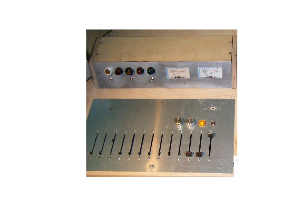 Das Mischpult funktioniert gut, gerade habe ich eine größere Umbauaktion abgeschlossen. Und zwar habe ich den inneren Aufbau geändert: Die Ausgangsklangregelung habe ich rausgeschmissen, weil diese immer noch leichte Verzerrungen verursacht hat. Dafür habe ich eine Mikro Klangregelung und eine Vorregelung für die Mikros eingebaut, das Gehäuse nun komplett fertig gestellt und die Platinen am Gehäuseboden angeschraubt. (Vorher waren sich diese "kopfüber" an einer Holzleiste unter der Aluplatte montiert.