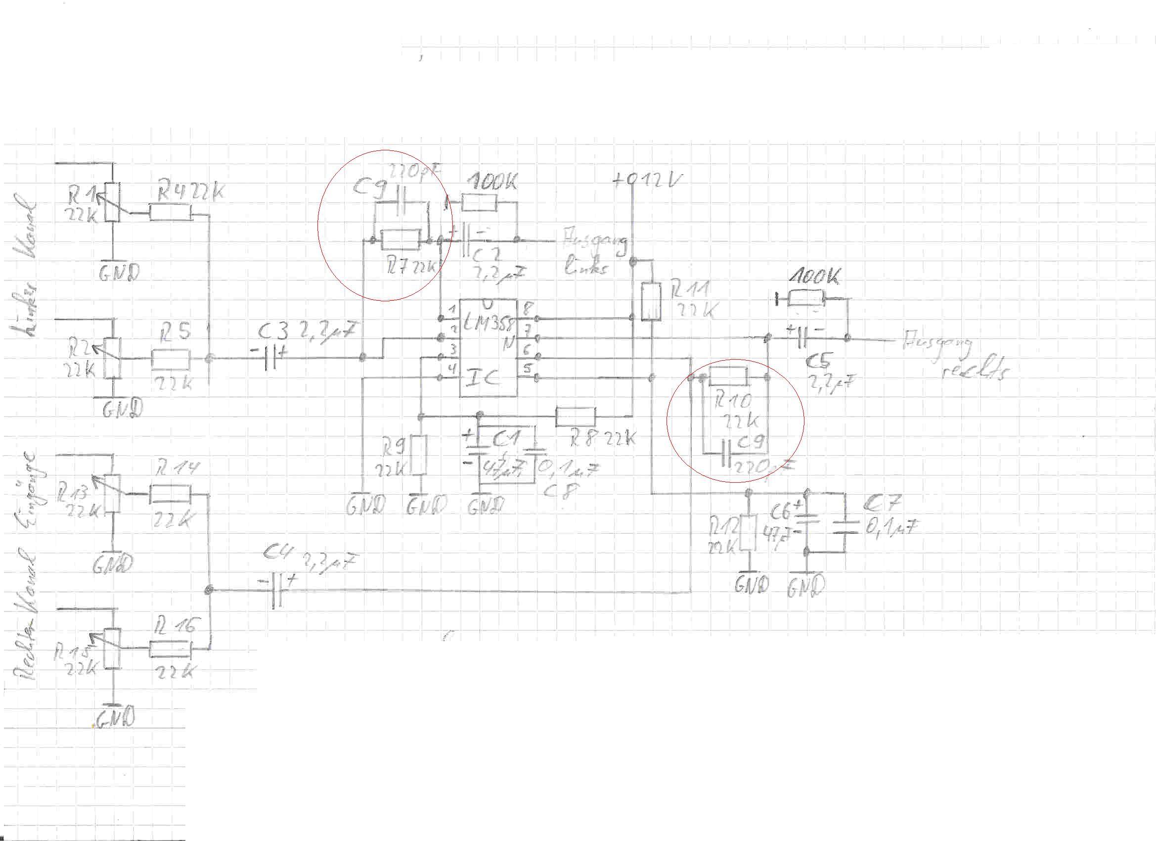 Das zweite Rauschproblem was ich habe, ist der LM 358 in der Misch/Verstärkerstufe. Wird der nachgeschaltete Grundig Vorverstärker mit Aktivboxen normal aufgedreht, hört man kein Rauschen, wird er etwas weiter aufgedreht, rauscht es sehr stark. Ohne angschlossenes Mischpult rauscht der Grundig überhaupt nicht. Probehalber hatte ich den LM 358 gegen einen NE 5532 getauscht, der rauscht nicht, brummt dafür aber und fängt auch an zu "heulen". Wie du gerade geschrieben hast, neigt der NE 5532 zu hochfrequenten Schwingungen, was für ein rauscharmes IC könnte ich denn in der Misch/Verstärkerstufe einbauen, wäre ein TL072 gut?