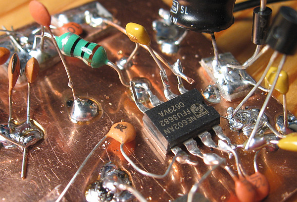 Hier sieht man den NE602 mit seinen hochgebogenen Beinchen, der mit Sekundenkleber auf der Kupferfäche befestigt ist.