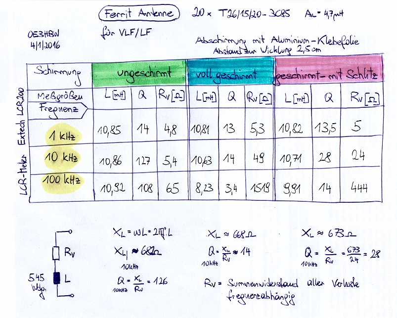 Habe nun die Antenne mit Alufolie geschirmt (siehe Foto) und eine erste grobe Messung vorgenommen (siehe Bild von Messtabelle). Diese zeigt eine starke Erhöhung der Verluste durch die Schirmung. Die Anbringung eines Schlitzes veringert die Verluste zwar, aber sie sind dennoch etwa 4,5 x größer als ohne Schirmung (trotz großem Abstand von Schirmung zu Windungen von 2,5 cm). Die Abschirmung des E-Feldes hat eben seinen Preis.