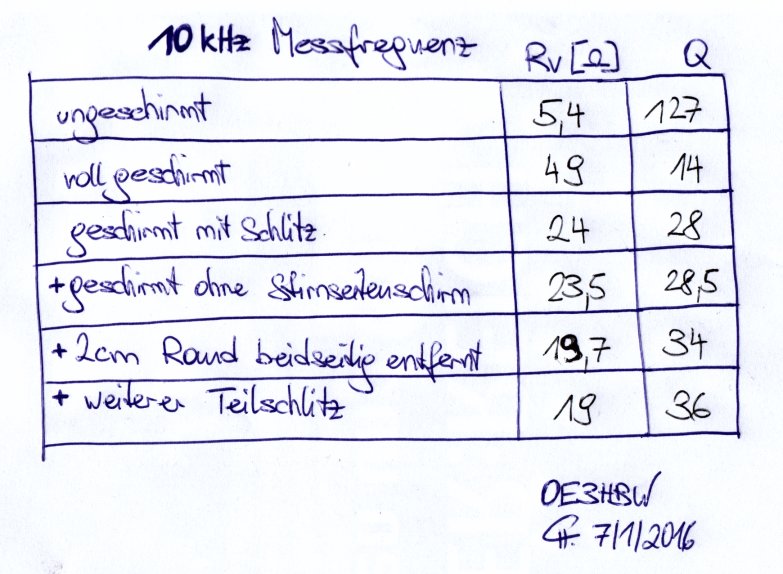 Die Abhängigkeit der Güte bzw. des Verlustwiderstandes von Parametern der Schirmung ist sehr stark (siehe auch Messdaten). Beispielsweise änderte das Niederdrücken (glattstreichen) von Falten der Alufolie den Verlustwiderstand um 0,5 Ohm!
