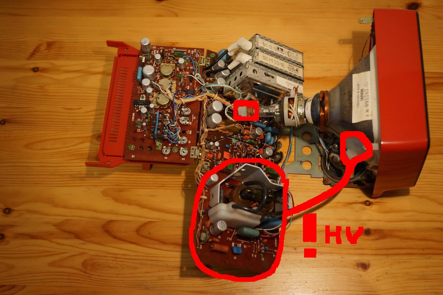 Be careful! Keep your hands off the HV-area if power is on! Don't touch red marked areas, because that's the dangerous High Voltage areas!