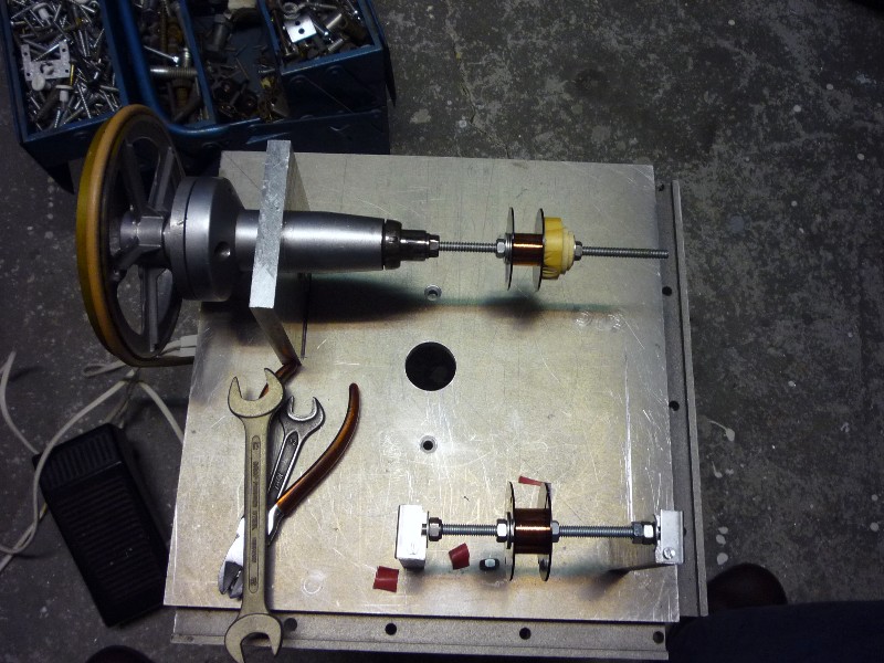 Hallo zusammen, Die Wickelmaschine ist mechanisch fertig und funktioniert. Sie wird durch einen Nähmaschinenmotor mit Fussregler angetrieben. Ich habe probehalber ca 3000 m CuL mit einer Stärke von 0,06 mm von einer Spule auf eine andere ohne Bruch umgewickelt. Die Drehzahl lässt sich sehr fein regulieren. Nach den 3000m ist jedoch der Anlasser ziemlich heiss geworden. Jetzt kommt noch die Zählvorrichtung, die mir Martin liebenswürdigerweise zur Verfügung gestellt hat zum Einbau. Grüsse Franz