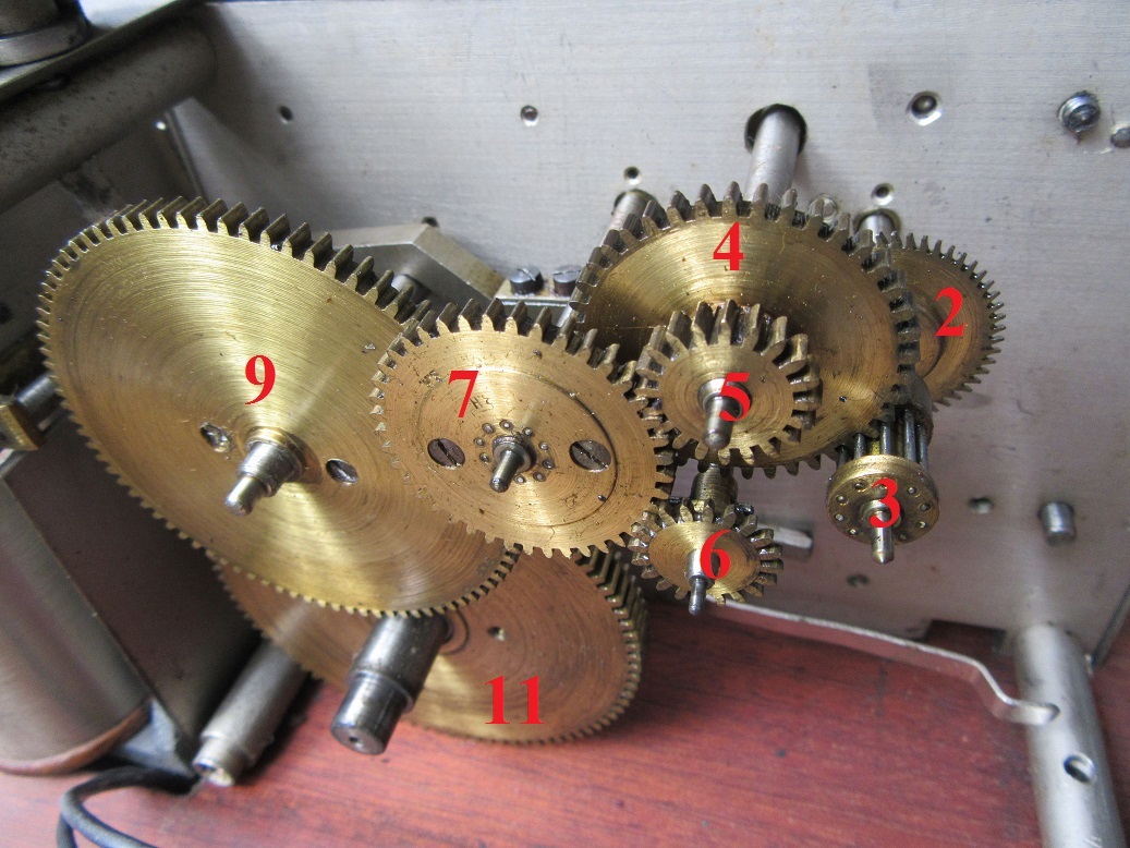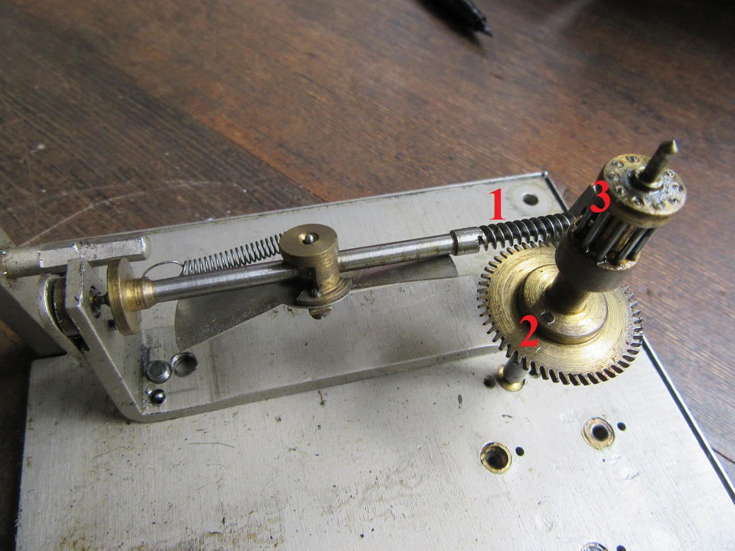 der Fliehkraftregler ist mir ebenfalls ein Rätsel. Ich vermute, dass das Teil nicht mehr richtig funktioniert. Auf der Achse ist eine kugelige Verdickung..... aber die kleinen Flügelchen an der komplizierten Messingbuchse bewegen sich nicht. Vielleicht nach fast 80 Jahren festgefressen. Ich lege das Teil mal in WD40 ein. Da keine mechanischen Verbindungen zu anderen Teilen bestehen, würde ich sagen, dass die Flügel, je nach Stellung einen gewissen Laufwiderstand bilden. Ich schaue mir das beizeiten nochmal genau an. Hilfreich wäre alles zu montieren, die seitliche Klappe zu entfernen und genau beobachten um den Unterschied zu sehen. Fakt ist, der Anlauf des Telegraphen ist gedämpft, vielleicht würde sonst das Band schnell reißen.