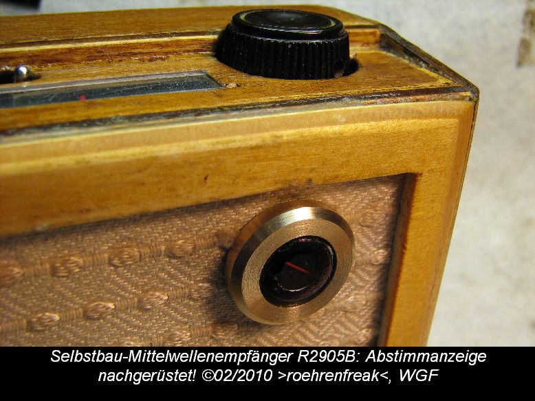 Franz und meine Wenigkeit hatten uns in anderer Sache für den vergangenen Samstag verabredet. Weil mir die bei ihm herrschenden, schwierigen Empfangsbedinungen bekannt sind, dachte ich - ok - nehme ich den "Kleinen Süssen" einmal mit. Zum Ausprobieren. Und wir kamen - wie immer natürlich heftig - ins Gespräch. Franz - ganz angetan von dem Radiochen - drehte sofort und ohne Umschweife eine passende Rosette aus edlem Messing. Wow - das war das alles entscheidende Element, welches nun für ein schönes Erscheinungsbild sorgte und eine Brücke zum guten, alten "Magischen Auge" geschlagen hat. Franz - alle Achtung und nochmals einen ganz herzlichen Dank!