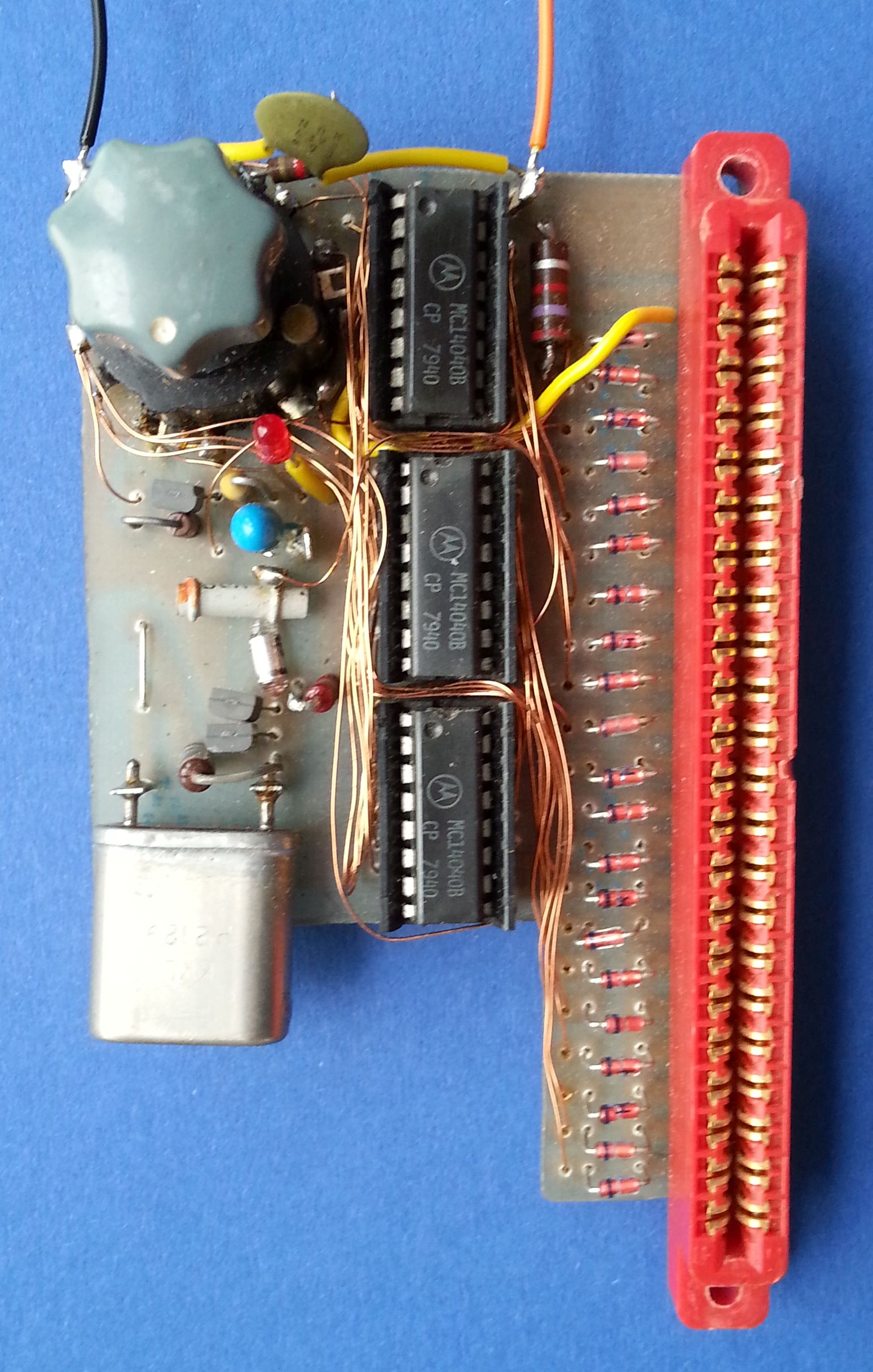 Rechts sieht man eine ISA-Slot-Leiste, dort stellt man in binärer Form den Teilungsfaktor ein (einfach durch Einstecken von Drahtstiften). Zusätzlich am Drehschalter lassen sich weitere Teilungen als Zweierpotenz einstellen. Es sind nur 21 Dioden vorhanden, wahrscheinlich hatte ich seinerzeit keine größeren Teilungsverhältnisse als notwendig erachtet. Damit schätze ich, dass sich Teilungsverhältnisse 1 bis 2^21 multipliziert mit 2^1 bis 2^12 einstellen lassen. Der Quarz schwingt mit (nur) 1 MHz.