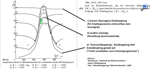 Fazit: Sowohl von der Theorie, als auch von der Praxis her sind kaum Unterschiede in der Trennschärfe festzustellen zwischen dem Punkt, wo noch keine Schwingungen einsetzen und dem Punkt, wo das Empfangssignal bei schwingendem Audion anfängt, leiser zu werden.